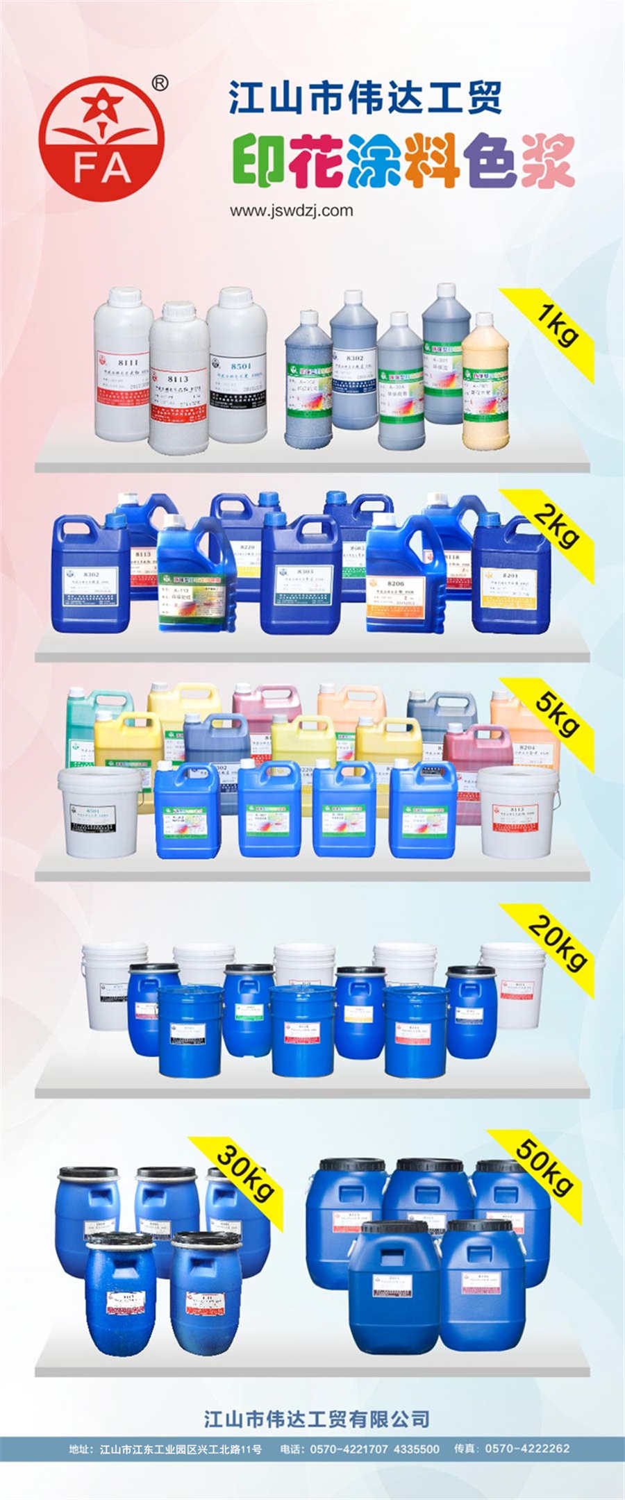 江山市偉達工貿(mào)有限公司成立于2003年,企業(yè)所在地位于浙江省衢州市江山經(jīng)濟開發(fā)區(qū)江東區(qū)興工北路11號。本公司是一家集“研發(fā)、生產(chǎn)、銷售”于一體的印花涂料色漿專業(yè)生產(chǎn)廠家,產(chǎn)品有普通型印花涂料色漿、環(huán)保型印花涂料色漿、耐高溫印花涂料色漿、玩具色漿、粘土色漿、內(nèi)外墻涂料色漿、DTF燙畫打印墨水、DTG直噴打印墨水、轉(zhuǎn)印分散墨水。本公司產(chǎn)品色譜齊全色澤鮮艷,著色力高,具有良好的堅牢度和化學(xué)穩(wěn)定性。