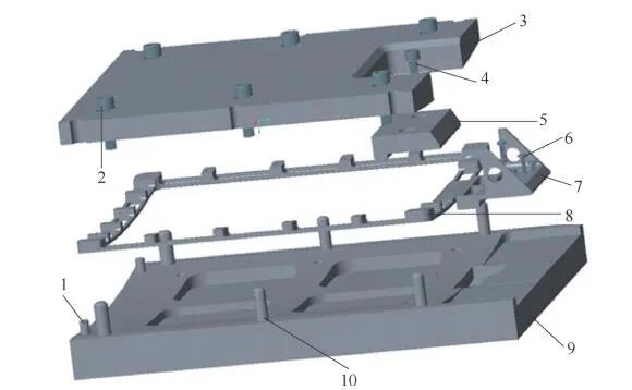 1—上下圓弧夾緊塊(10件) 2—圓形鉆套 3、9—矩形鉆套